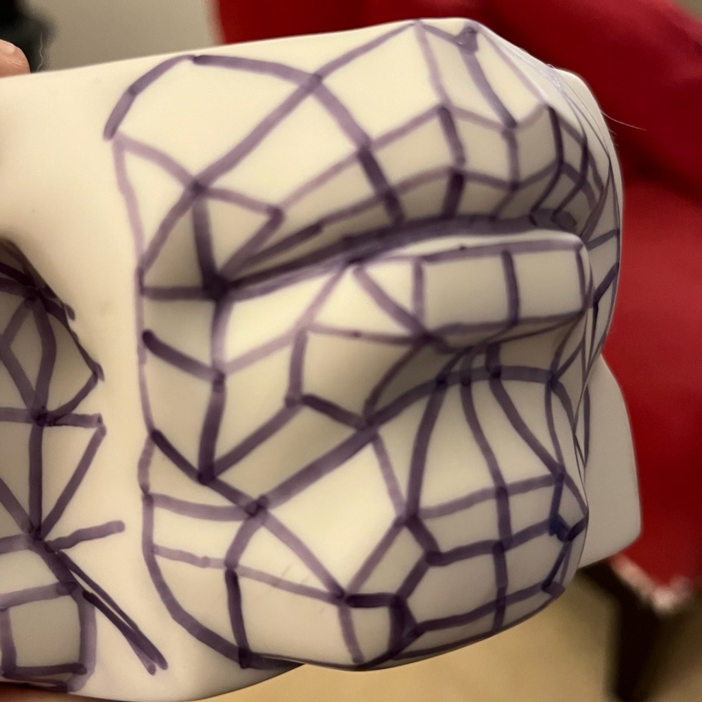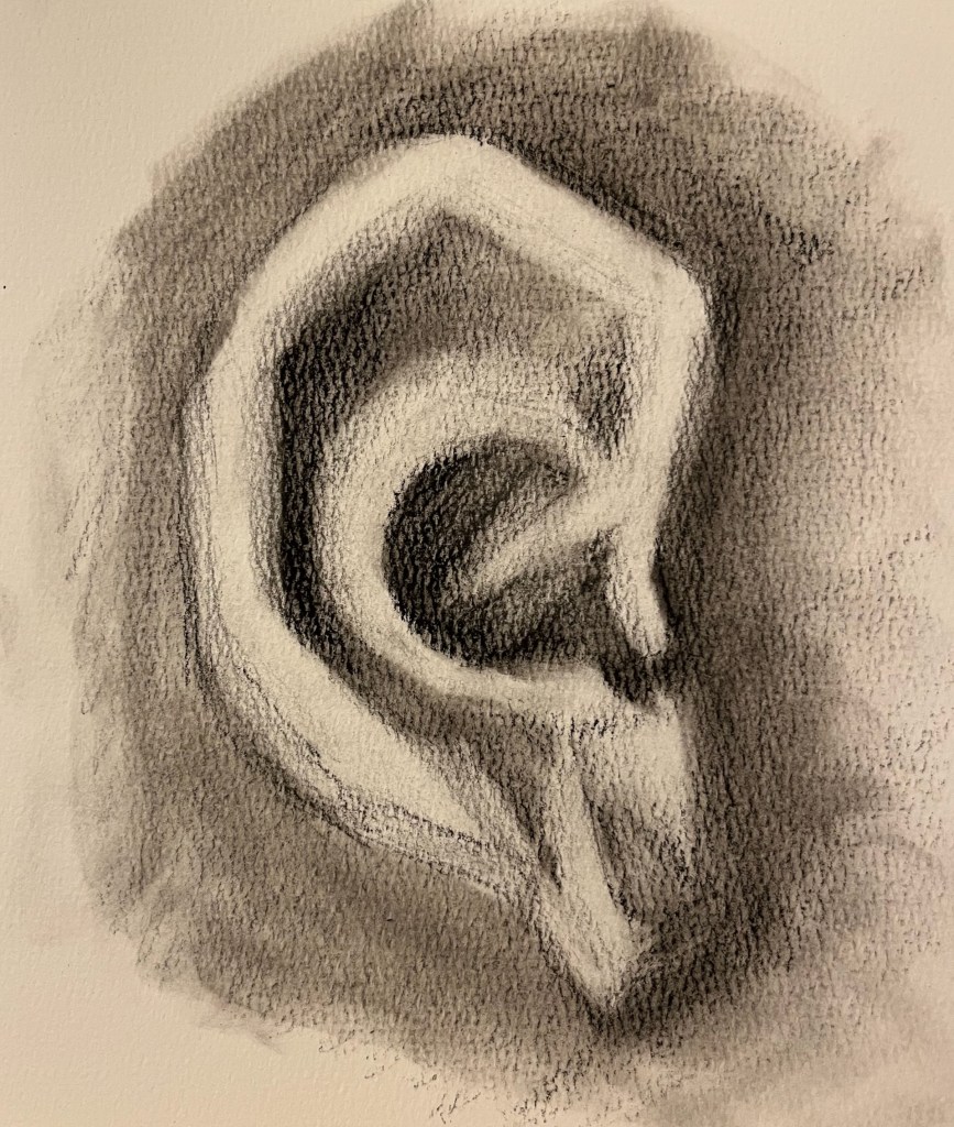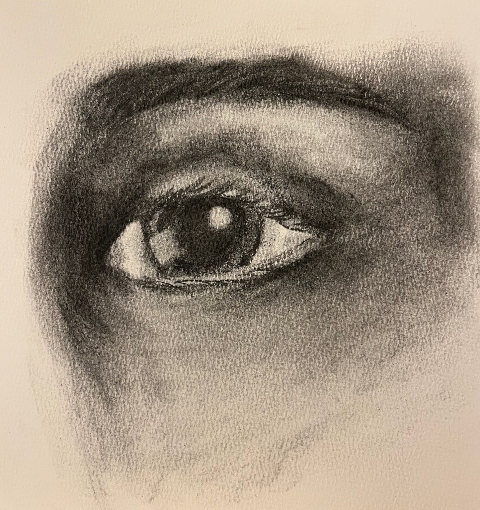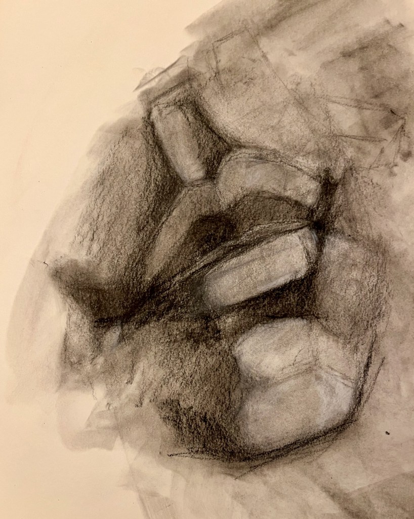 Charcoal on paper. I purchased a small 3D model to help me learn how to draw facial features better. After this drawing, I used marker to add lines to the model to help make the geometry more obvious. I’m still struggling with the far side of the mouth, though. I love the look of compressed charcoal, which I used on the mouth, but I switched to willow charcoal for the eye (on watercolor paper).
