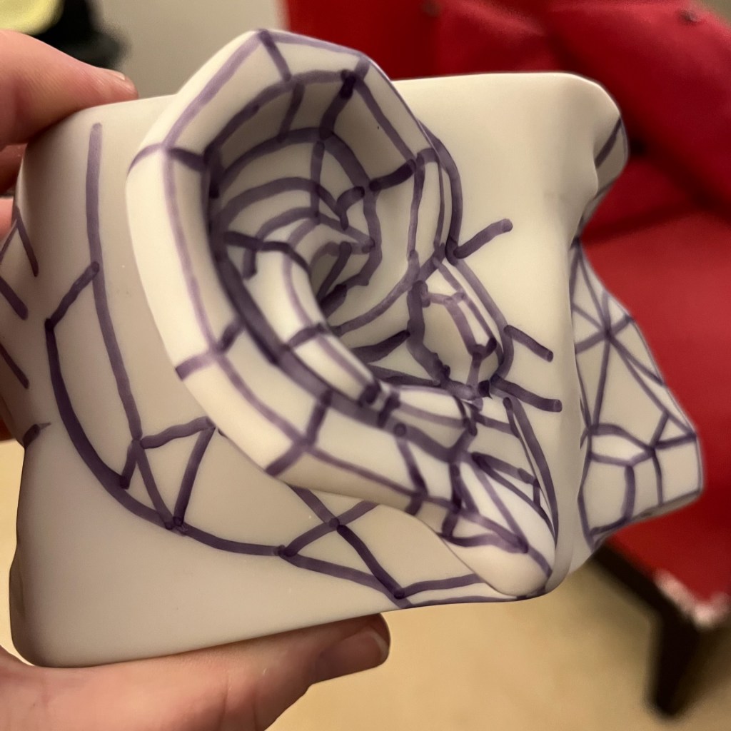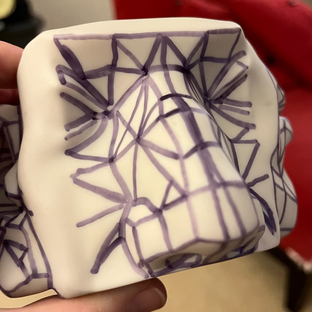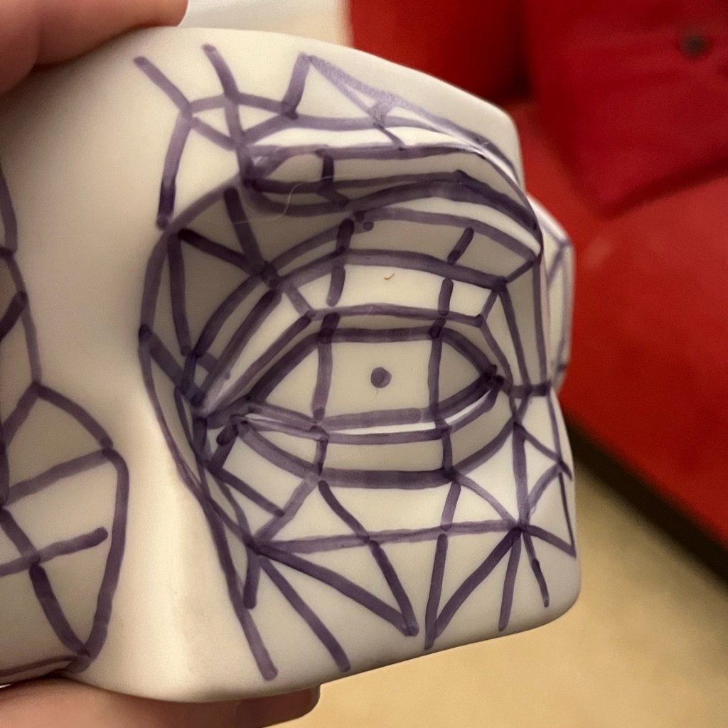 Charcoal on paper. I purchased a small 3D model to help me learn how to draw facial features better. After this drawing, I used marker to add lines to the model to help make the geometry more obvious. I’m still struggling with the far side of the mouth, though. I love the look of compressed charcoal, which I used on the mouth, but I switched to willow charcoal for the eye (on watercolor paper).
