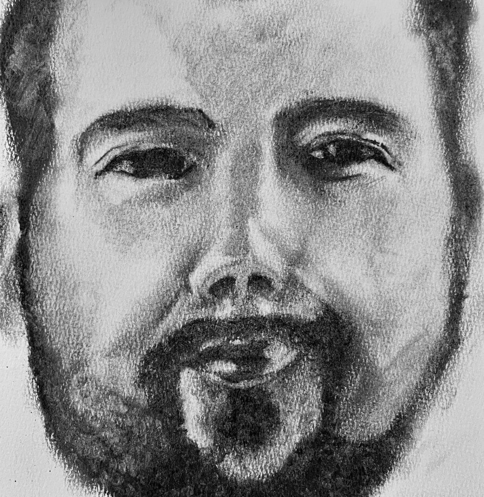 Charcoal on paper. My first attempt using a high contrast image as reference. I’m happy with the eyes, and the nose is ok. I think I made his face too wide, though, which is making the mouth look super small.